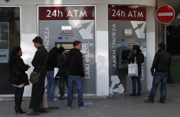 当地时间3月17日,塞浦路斯民众在首都的Laiki银行ATM前取钱