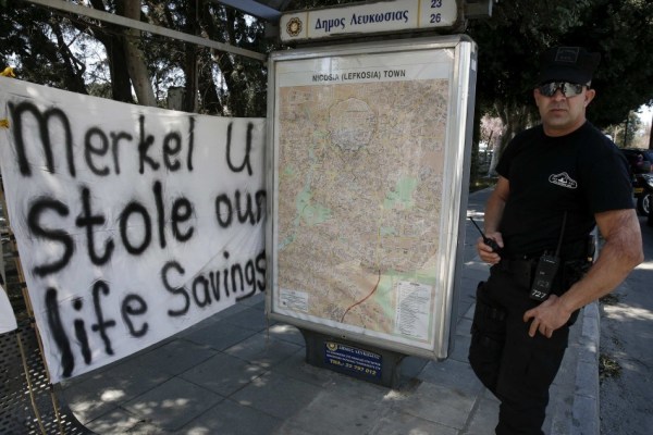 民众举行了抗议活动,还纷纷挤兑以避免自己的存款被课以重税。图中标语大意为:“默克尔你偷走了我们的毕生积蓄!”