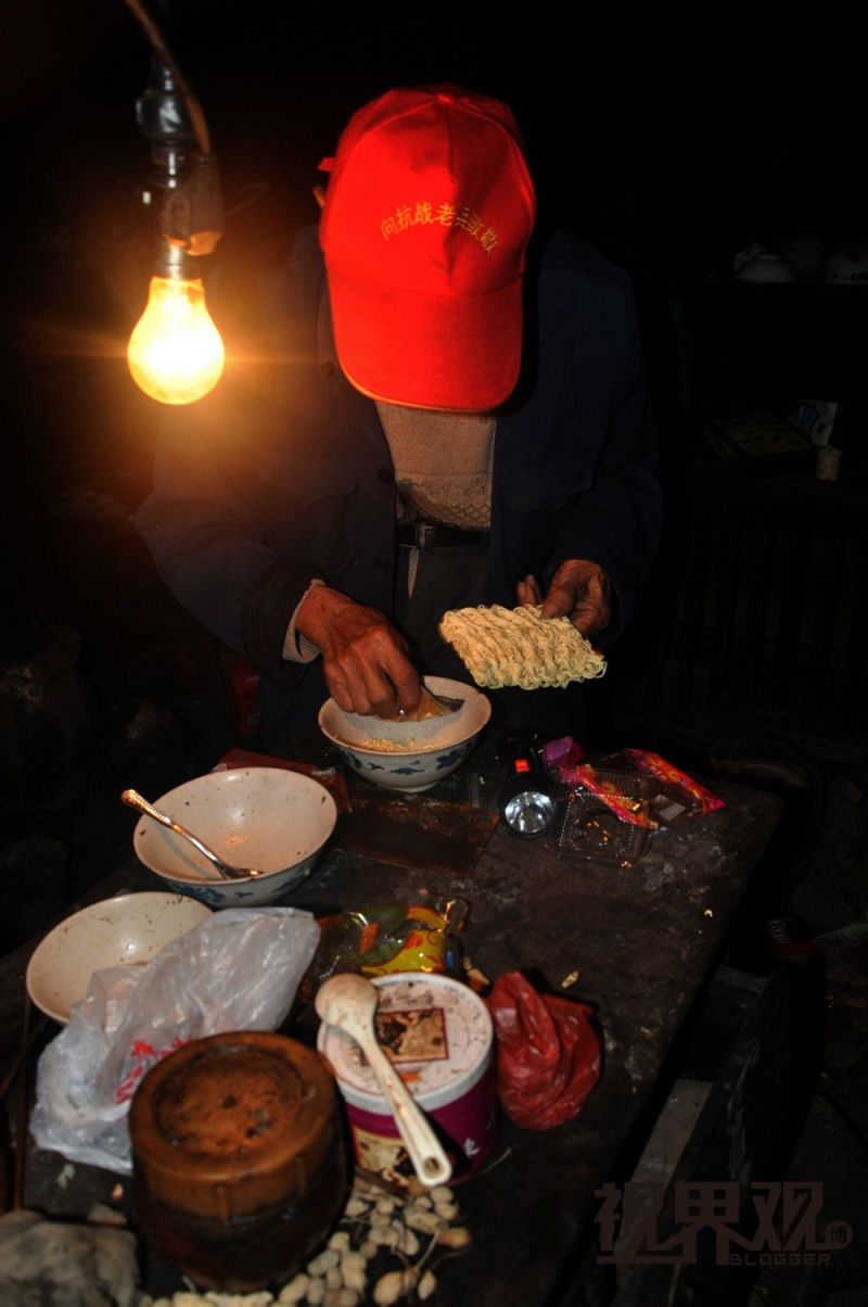 龍老說壹天吃兩頓飯,晚飯壹般不吃,龍老患有胃病大半輩子,吃多了睡不著。大多時候吃方便面,燒開水泡就是,很方便。吃米飯還要做菜,年紀大了,行動不便,太麻煩。要是身體不舒服,自己會跟兒子兒媳吃。圖為龍老壹早起來在泡方便面。
