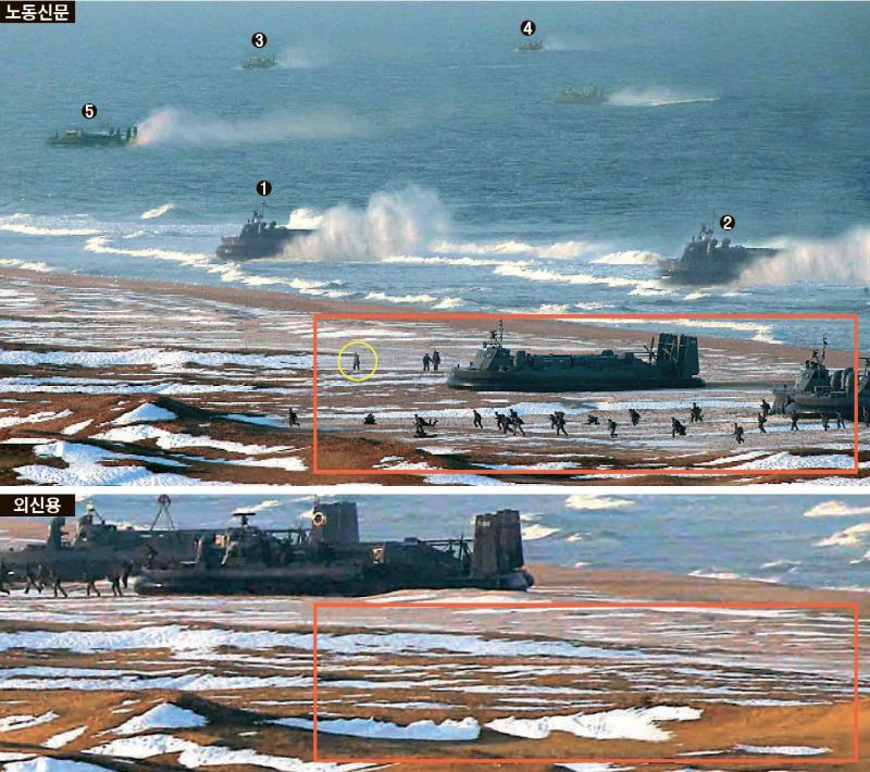報道稱,疑似合成的部分是登陸後氣墊船區域(紅色方框)。上下兩張照片為同壹拍攝地,但拍攝的地形卻不同。上面壹張照片中紅色方框內的人民軍(黃色圓圈)後面基本看不到雪,但下面壹張照片的相同位置卻有壹段約2米長的雪路。另外,經過分析比對船體與水花等,照片裡的8艘軍用氣墊船,只有5艘是真的,其它3艘有造假嫌疑,應為電腦合成。