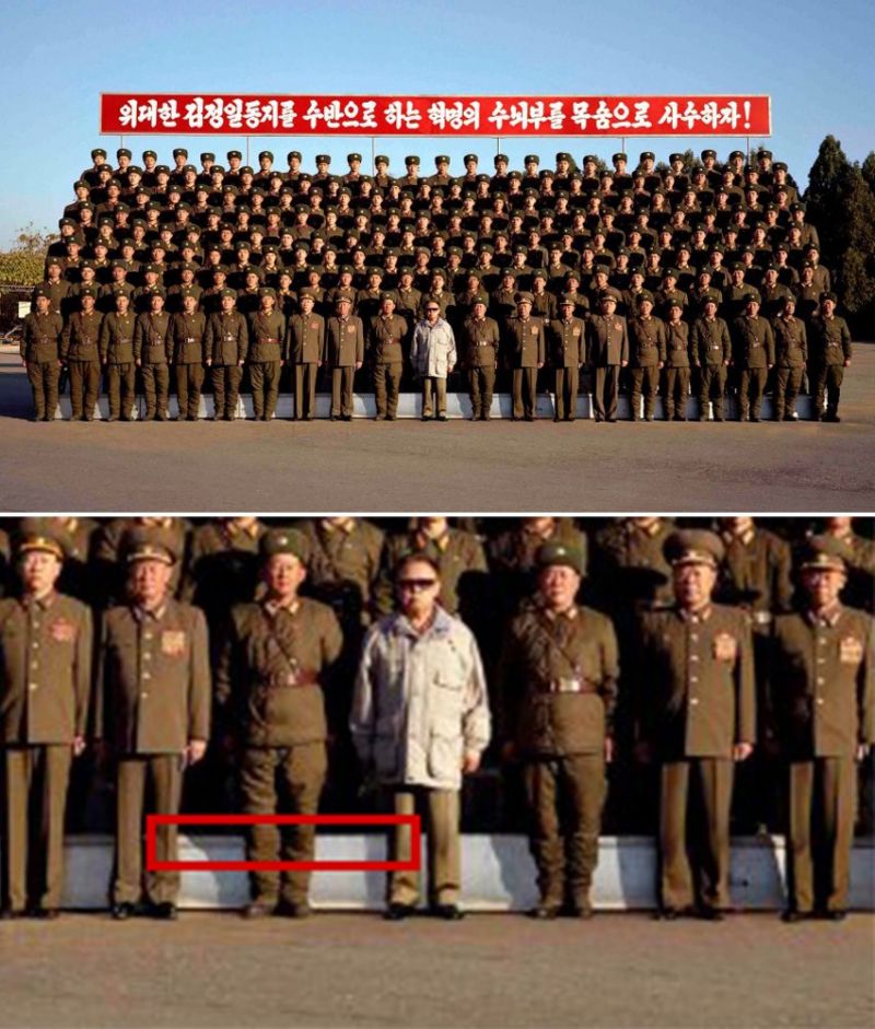 2008年壹篇報道中有壹張照片是金正日和朝鮮軍隊的合影,其實這照片是假的。你看金正日的小腿影子和他身旁士兵的影子偏向了不同的方向,而且首排士兵沿著壹條黑線站著,但到金正日這裡時,線就斷了。