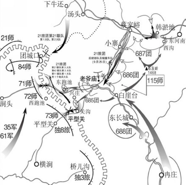 平型关古称瓶形寨,周围地形如瓶,在山西繁峙县东北与灵丘县相交界的平型岭下,雁门关之东。平型关北的恒山高峙如屏,关南矗立五台山,两山都是陡峻的断块山,海拔在1500米以上,是晋北的交通障碍。两山之间是一条不太宽的地堑式低地,是河北北部平原与山西之间的最便捷通道。图为八路军115师副师长----聂荣臻。