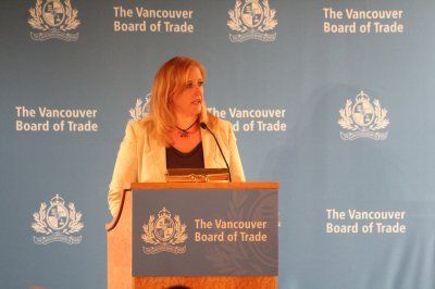 蕾蒂在溫哥華貿易理事會發言。(記者倪怡婧/攝影)