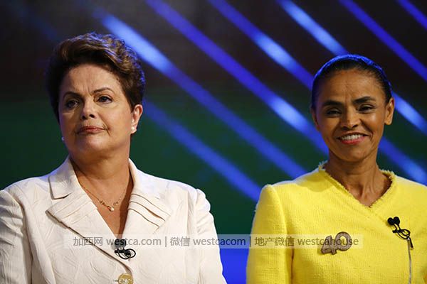 巴西现任总统争迪尔玛•罗塞夫(左)和顶替坠机身亡的社会党候选人爱德华多•坎波斯出战的玛丽娜•席尔瓦(右)出席电视辩论。
