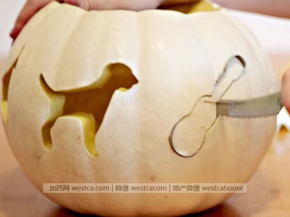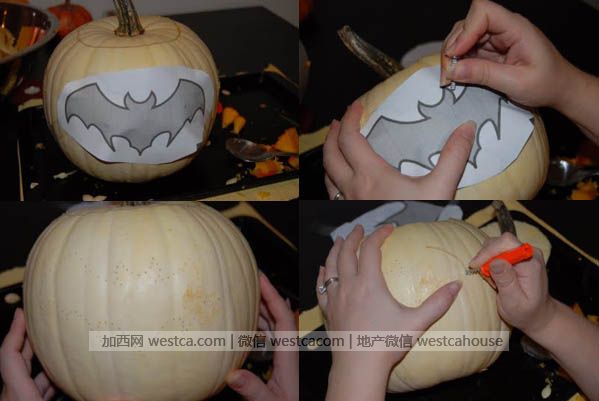 4. 当然最简单的办法就是去超市买南瓜雕刻的模型至,用钉子或tape固定在南瓜上就可以开雕啦!