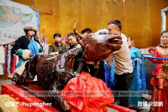 吃烤全牛之前要举行隆重的开刀仪式。现场请出尊贵的客人连干3碗吉祥酒,接着给牛头的哈达花剪裁,切一块最好的肉吃掉……