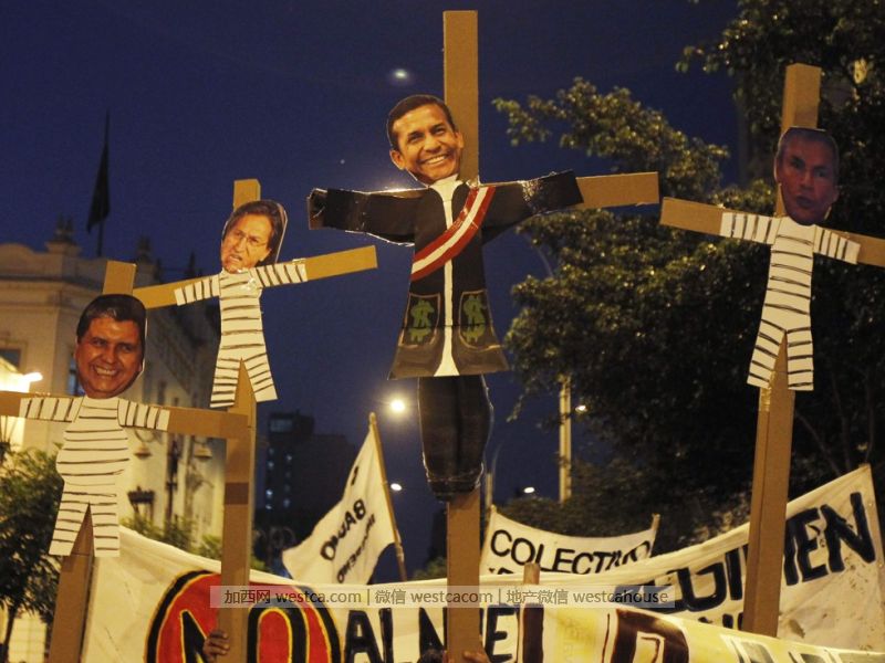 2015年1月15日利馬,反對政府新青年勞動法的示威者在游行期間與防暴警察發生沖突。圖為示威者在游行期間高舉掛有秘魯總統奧良塔·烏馬拉(Ollanta Humala,中)以及前總統阿蘭·加西亞(Alan Garcia,左壹)和亞歷杭德羅·托萊多(Alejandro Toledo,左贰)圖像的拾字架。