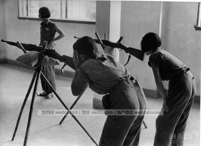 在一间室内射击场里,年轻的中国姑娘们在用三角架上的步枪练习瞄准。她们刻苦学习,争取提高射击技术。