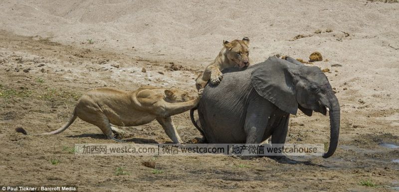 但是,幼象终于因为体力不济,逃不脱狮子们的狡猾攻击。