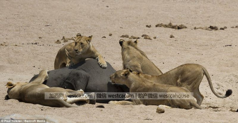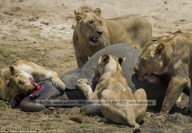 狮子们齐心协力,按倒幼象,群起而分之,终于让自己饱餐一顿。