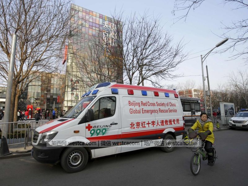 12月24日,北京三里屯周边安保升级,救护车在附近停驻,以应对突发事件。