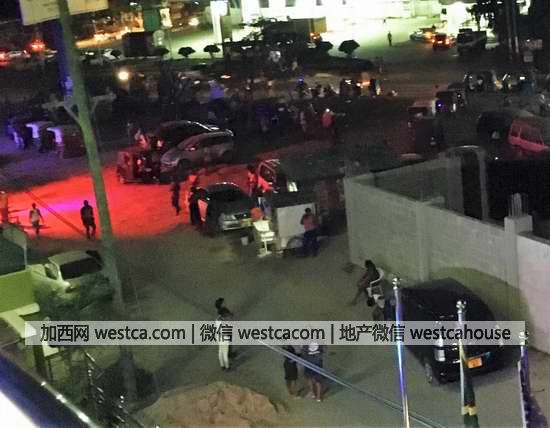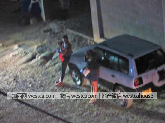 实拍达累斯萨拉姆的站街女。前面那对男女正在谈业务,远处那红灯可能就是经灯区的象征。