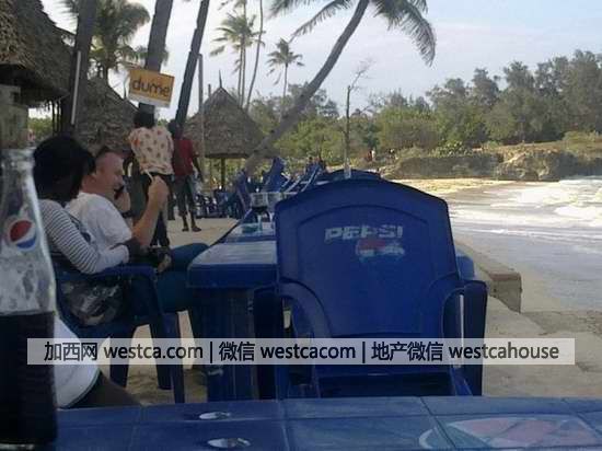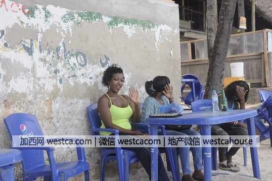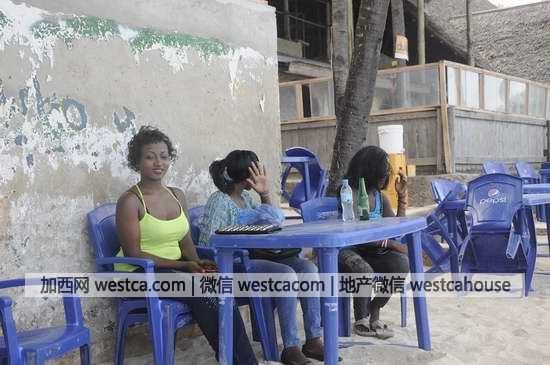 在可可海滩露天酒吧里,来这里喝酒喝饮料的人不少,有当地人,也有外国人,当然我们也算外国人。这里,还一个特殊的人群—性工作者。我们先前还不知道,只是我们的黑人司机会告诉我们的。她们要么是单个的来,要么是成群的来。尽管是白天,她们也会到海滩来坐坐,喝一瓶饮料还吃一盒饭。但她们来的主要目的还是拉生意,照现在流行的说法就是“约炮”或陪聊陪酒。但居士就不明白了,如果她们没有生意,还要这里消费吃喝,不是亏了?也可能她们夜间做了生意,白天出来消费一下,放松一下也不定。