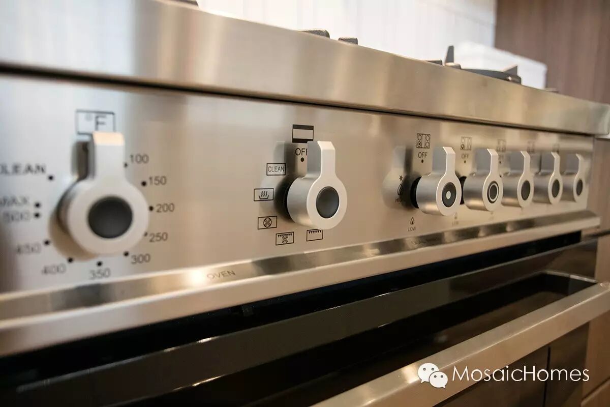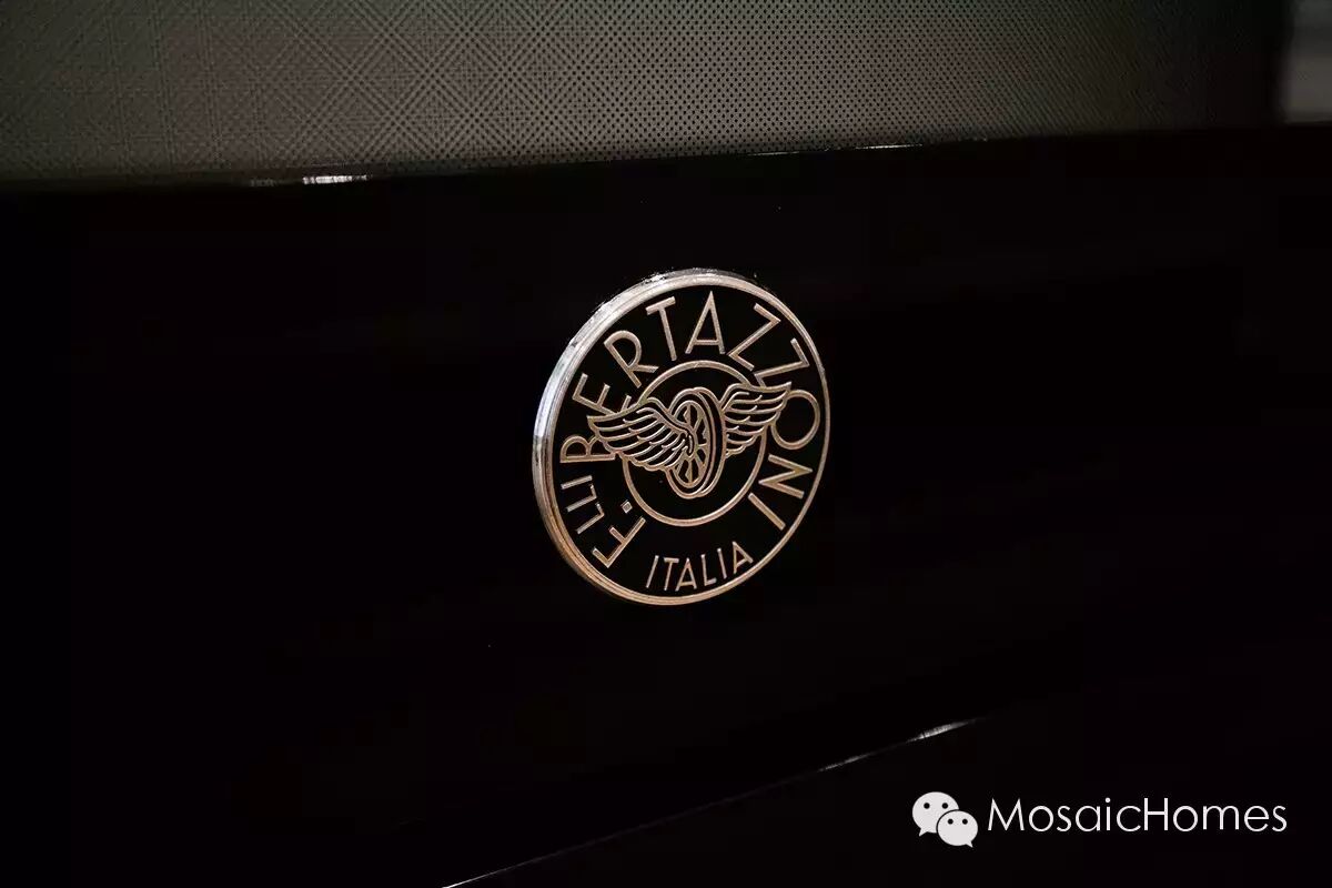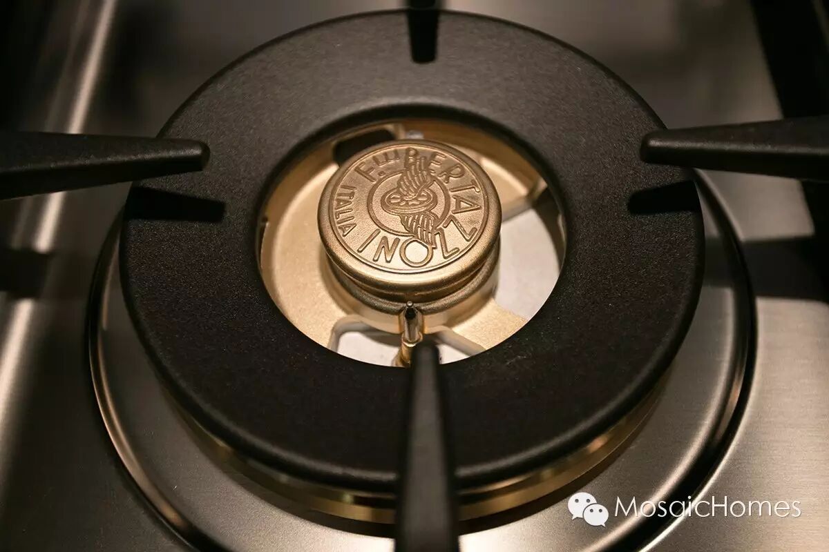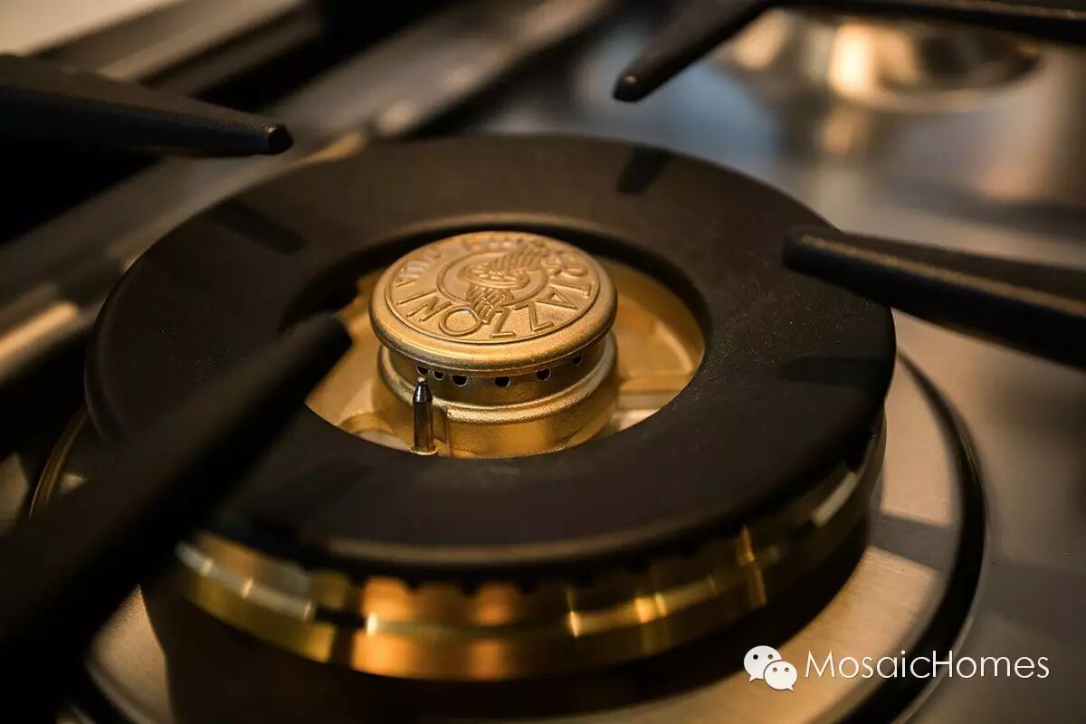 优质的细节,例如 Bertazonni 炉灶和烤箱。零厨灶周身增添了优质的视觉感; 烤箱是用在法拉利车场进行喷漆,衬托炉面的黄金 Bertazonni 标志,低调而又奢华。