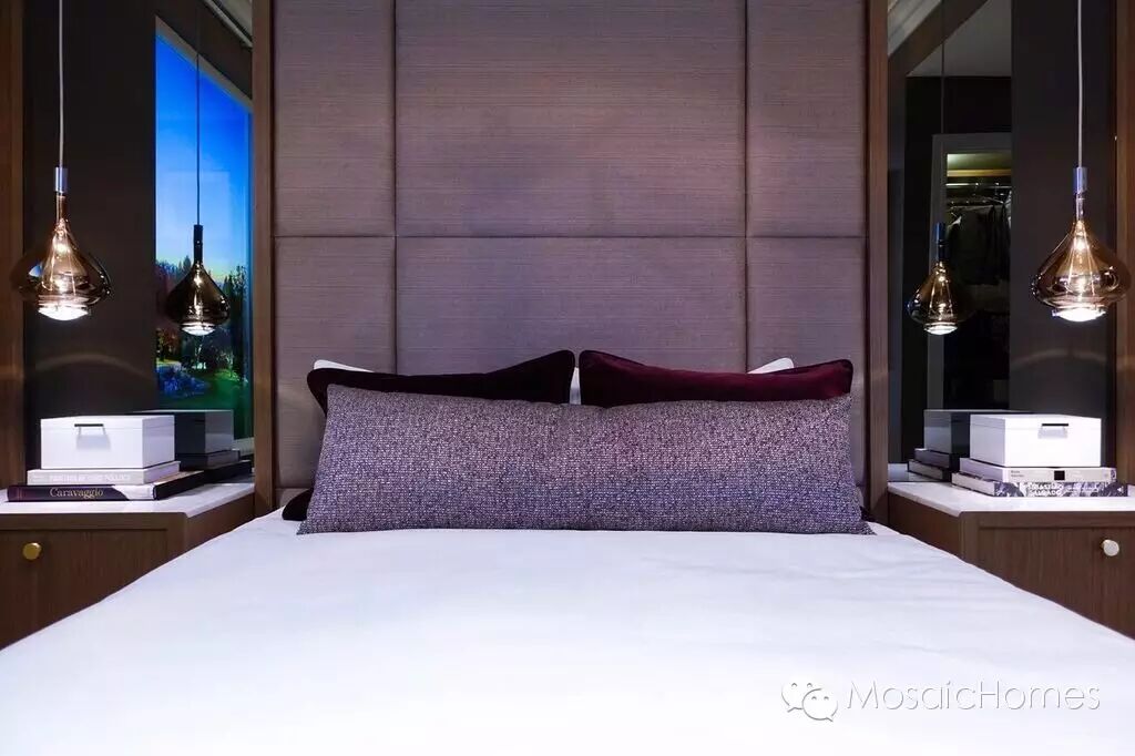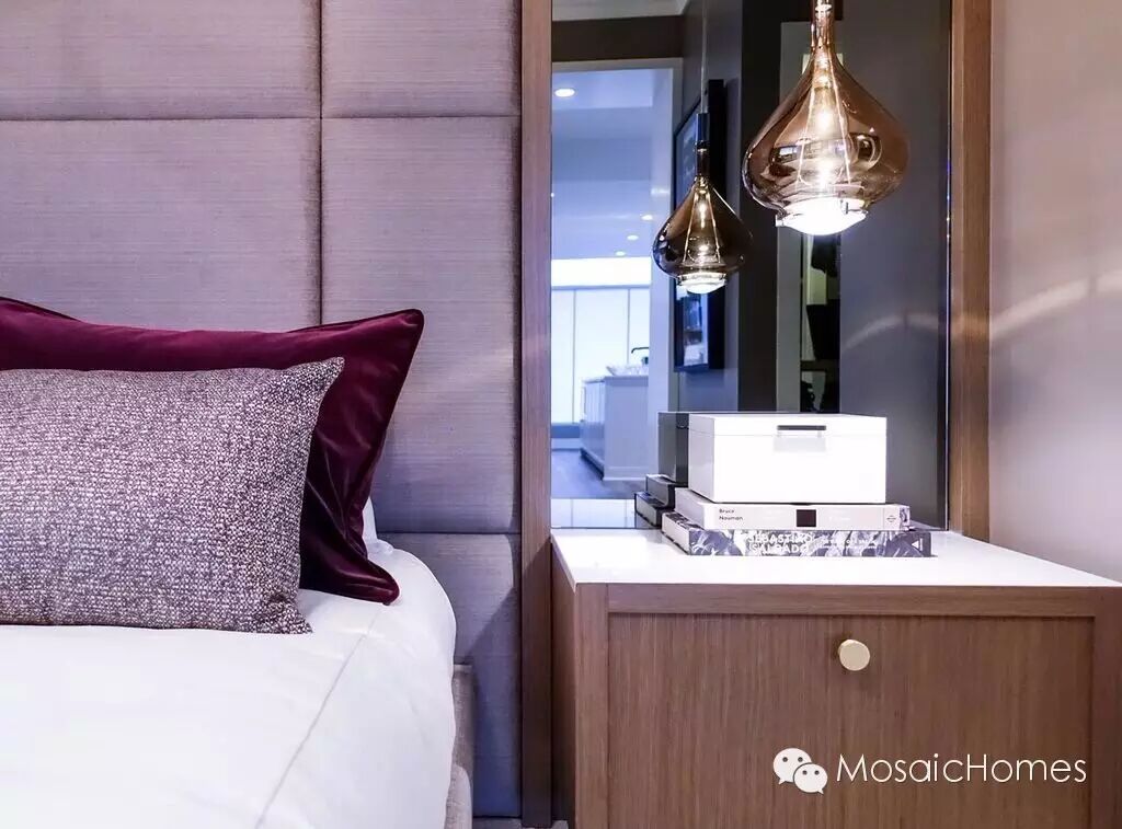 展示中心的卧室和浴室有几处将细节升高的设计,如大理石的台面,如与餐厅重叠交错的吊灯和装潢相一致的床头柜。
