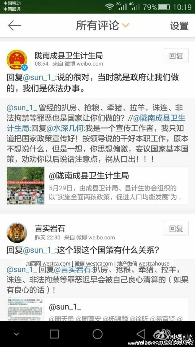 隴南成縣計生委稱,計生委的扒房,搶糧,牽豬,拉羊等等都是政府的旨意,而且是依法辦事!金鳴評:村裡老百姓說比日本鬼子還壞的就是搞計生的,又要錢又要命!現在計生委說是政府讓幹的,大家注意了:不是法律讓幹的。計生委不想給領導背黑鍋了?壞事兒都是政府讓你幹的、既然你們這麼聽政府的話、政府少給你們發了壹點錢、少了壹個事業編制、你們為什麼要抗議?為什麼不聽政府的安排?為虎作倀,兔死狗烹,其實現在需要犧牲你們成全政府,不要喊冤,繼續服從就好!如果扒房,搶糧,牽豬,拉羊在你們眼裡都是依法在辦事,那麼我想問這是什麼樣的狗屁政府?就是日偽政府恐怕也要裝模作樣地做些親善的舉動吧?