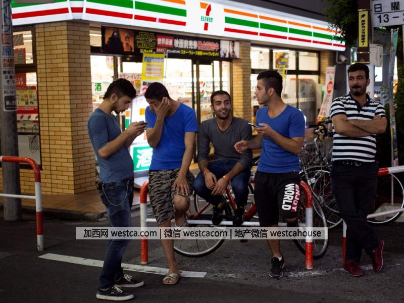 图为库尔德男子在一日本便利商店外有说有笑。