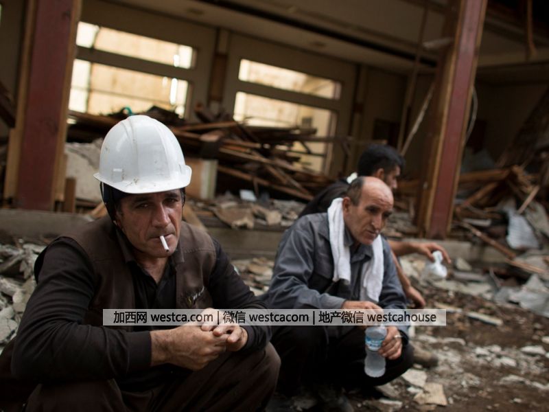 2015年10月21日,日本千叶市,库尔德工人在拆迁工作间隙休息。