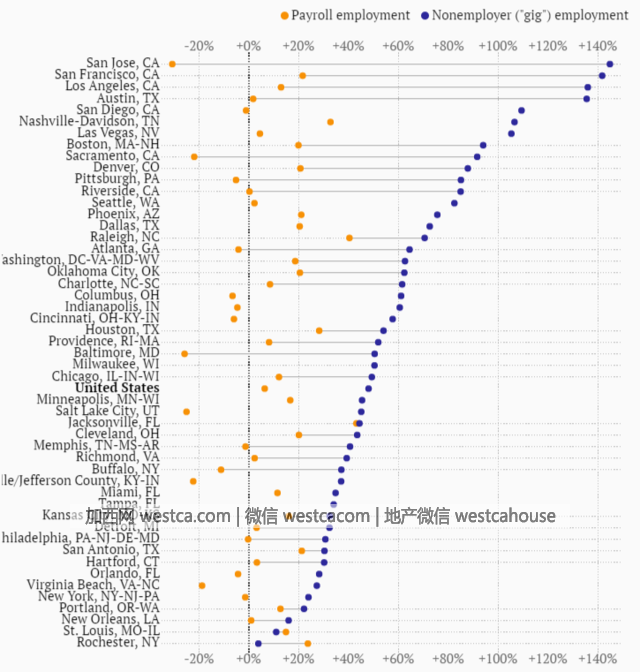 在Muro與Ian Hathaway上個月發布的壹項研究中,Muro統計了2010~2014年美國50個大城市中傳統工作與零工經濟的就業人數變化。數據顯示,2014年,在交通共享的15個城市以及住房共享的10個城市中,盡管經濟緩慢復蘇,但就業人數都有所下滑。例如,在聖何塞零工經濟的就業增加了145%,而傳統就業人數則下滑了31%;在薩克拉門托的零工經濟就業增長92%,但傳統就業人數減少22%;匹茲堡的自由職業者增加了85%,但傳統就業人數則下滑5%。