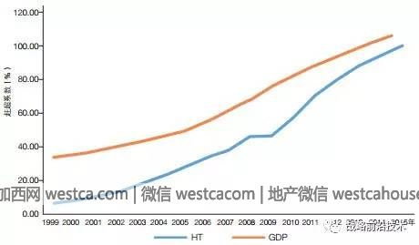 圖 3 中國GDP與高技術產業增加值趕超系數(1999-2015年) 中國GDP(PPP,2011年國際美元)與美國的比值,用來表征經濟發展的生命周期。數據來源:世界銀行數據庫;中國高技術產業增加值與美國的比值,用來表征產業發展的生命周期,數據來源美國國家科學基金會。美國=100%