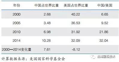 圖 2 中國、美國高技術產品出口額占世界比重(2000-2014年) 數據來源:美國國家科學基金會