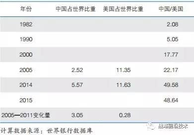 中國經濟本身就存在發展生命周期,為了便於國際比較,我們使用聯合國與世界銀行推薦的按照購買力平價(PPP)(而不是匯率)轉換成以通用貨幣計算的數據[17],即以中國GDP(PPP,2011年國際美元)相對於美國的趕超系數來表征,可以劃分為:初步成長期,1990-2000年,趕超系數從16.60%提至35.79%,提高了19.19個百分點,平均每年提高1.9個百分點;快速追趕期,2000-2005年,追趕系數提至50%以上,提高了14.53個百分點,平均每年提高2.9個百分點;加速追趕期,2005-2010年,追趕系數提至80%以上,提高了32.27個百分點,平均每年提高6.45個百分點;進入超越期,到2015年趕超系數升至108.79%(表 5),提高了26.2個百分點,平均每年提高5.24個百分點。