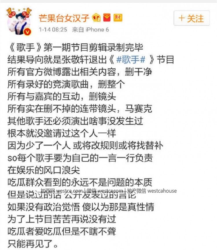 更有爆料說,不但是微博中刪光了他的相關內容,連錄好的歌、還有節目中所有出現的鏡頭,全被刪光光。