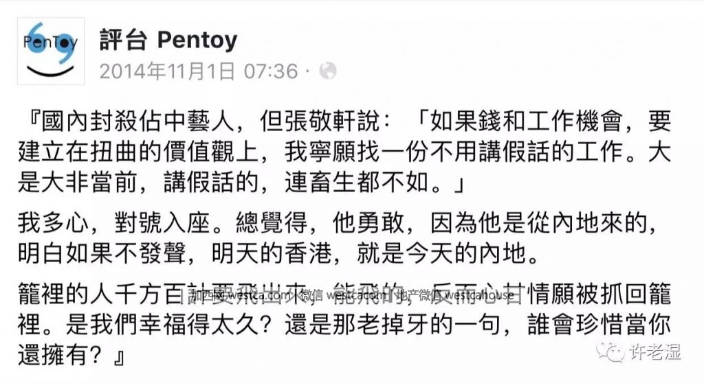 當然,有壹說壹,張敬軒本身還是會為內地的災難祈福、捐款,也會為保釣、南海聲援,他也會主動維護內地人的尊嚴。▼▼▼