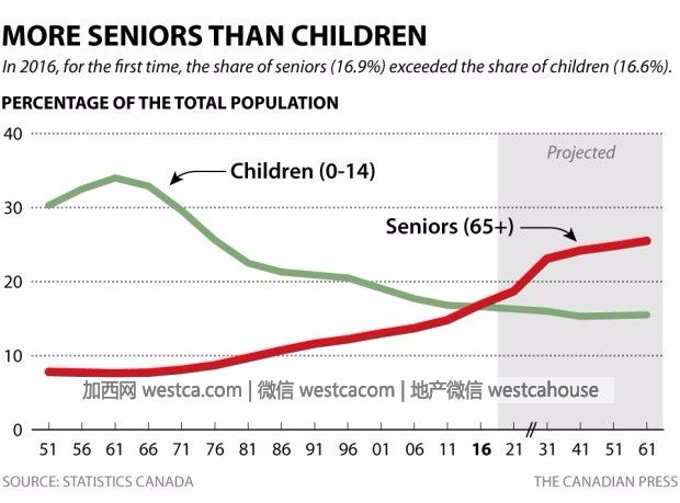 预测表明,加拿大人口的不平衡只会加大。 到2031年,约23%的加拿大人可能是老年人,类似日本,世界上最古老的国家。
