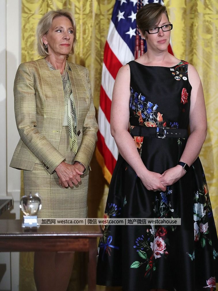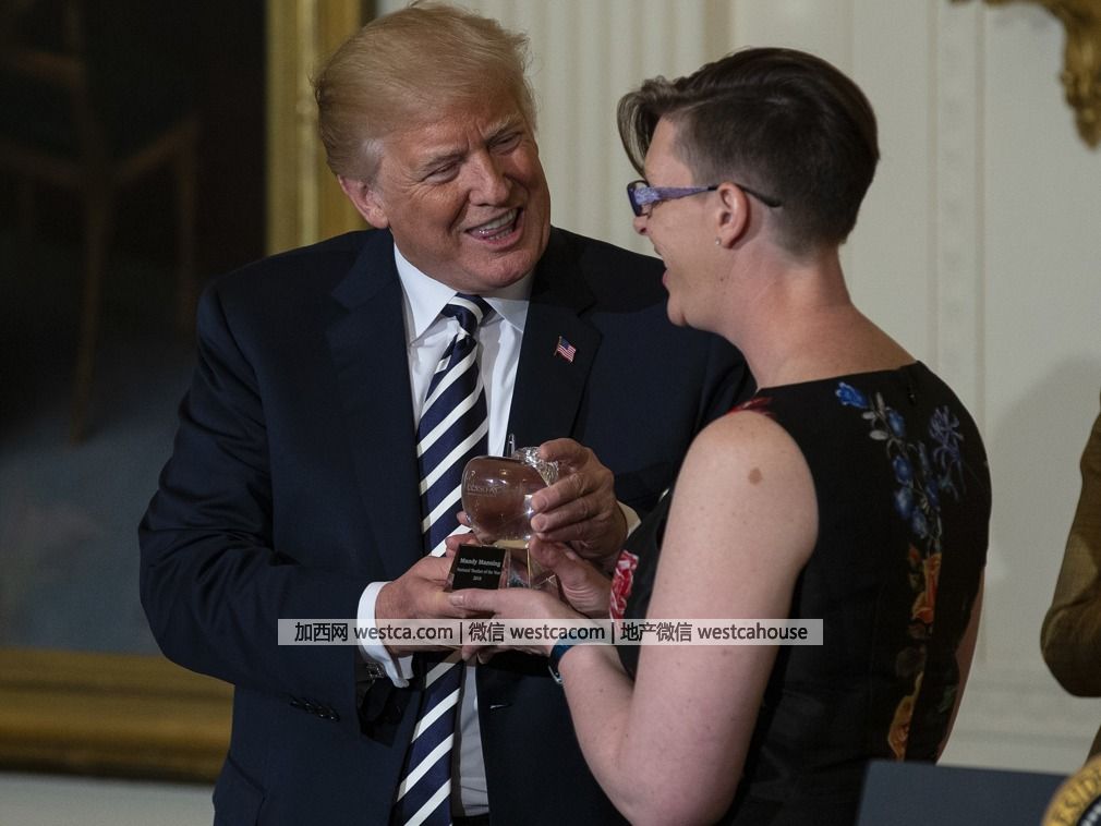特朗普表示,“曼寧帶著她的熱情從事公益和教育工作,在那裡,她教授了六年的英文和數學,她的忠誠為自己贏得了學生、同事、校園、社區和整個國家的尊敬。”圖為曼寧在聽特朗普講話。(圖源:VCG)