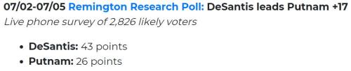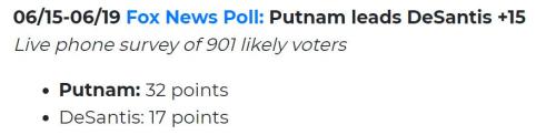 川普在过去进行的党内初选中,成了名副其实的王牌。拿刚刚结束的佛罗里达州共和党初选来说。川普的忠实支持者DeSantis今年角逐佛罗里达州州长遭遇了建制派Putnam的压制,在竞选资金上更是处于1:5的劣势。这是六月中旬的民调数据:
