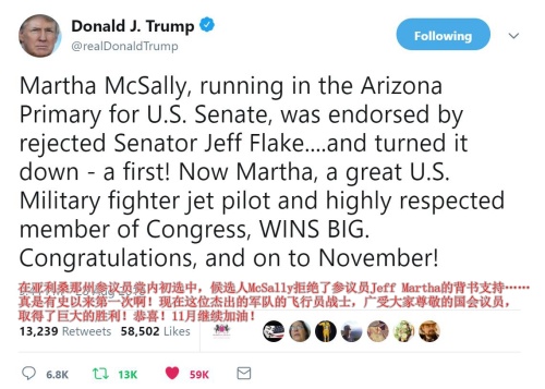 前几天,在亚利桑那州,角逐参议员的候选人McSally顺利获得了党内提名。Mcsally和建制派关系很好,所以川普没有明确支持她。