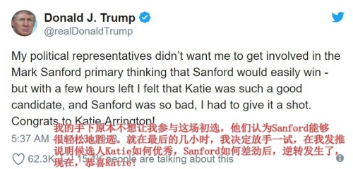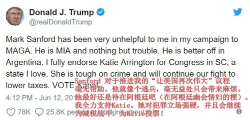 那么对川普不感冒的候选人是什么样的处境呢?建制派出身的南卡罗莱纳议员Sanford对川普一向是批评态度,川普在共和党初选前不足24小时,宣布支持Sanford的党内挑战者Katie。