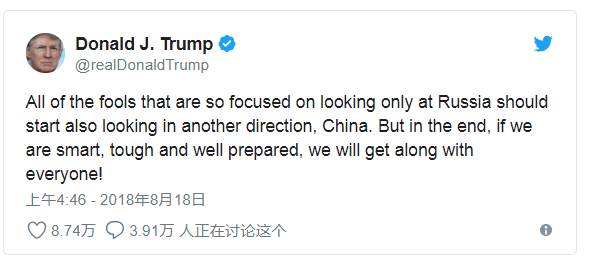 上月18日川普总统曾发出一则推文,“所有只会紧盯着俄罗斯的傻子们,应该开始朝另一个方向望去,就是中国(共)。但如果我们够聪明、强硬,并且做好准备,最终我们能与所有人相处得宜。”