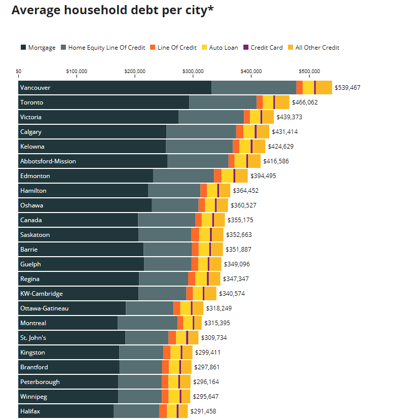 根據加拿大房貸和住房公司的研究統計,在加拿大36個主要城市中,居民家庭負債水平居前叁位的加拿大城市是溫哥華、多倫多和維多利亞市。溫哥華以平均負債53.9萬加元位居榜首,居第贰位的多倫多市居民家庭平均負債46.6萬加元,居第叁位的維多利亞市居民的平均負債水平是43.9萬加元。