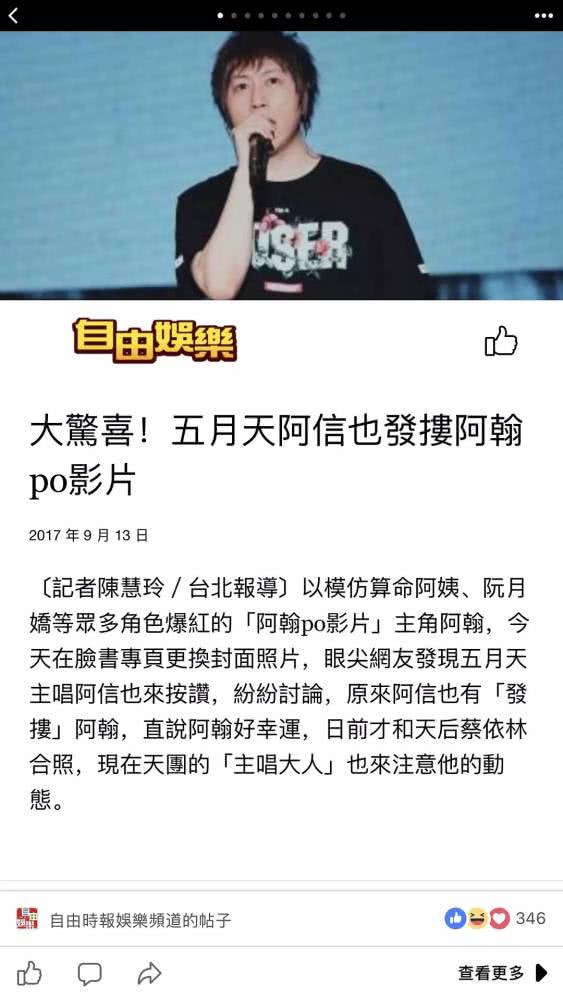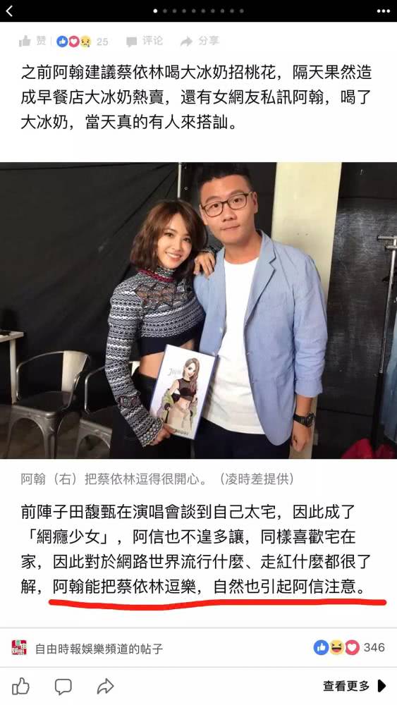 Jolin和这位在网络爆红的模仿大咖阿翰拍照,阿信就迅速点赞阿翰本人社交书上的封面照片。