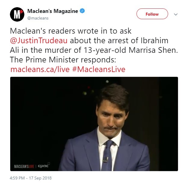 而总理杜鲁多在申小雨遇害后的一年接受《麦克琳》(Maclean's Magazine)专访时,才对华裔女孩申小雨被害一案首次作出回应。