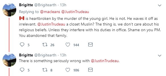 加拿大人都为小女孩被杀感到心碎,但他不是。他当作无关紧要的事一带而过。杜鲁多是个秘密的穆斯林?问题是,我们不在乎他的宗教信仰,除非这妨碍他的工作。总理,我们都为你感到羞耻。你抛弃了那家人。