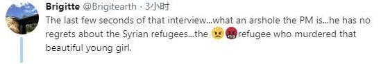 采访的最后几秒…总理真是个混蛋…他对叙利亚难民一事,对于那个谋杀了一位年轻漂亮的小女孩的难民,丝毫没有悔意