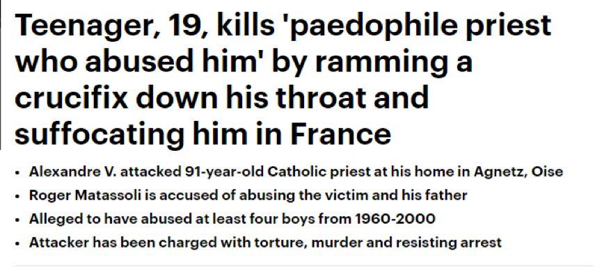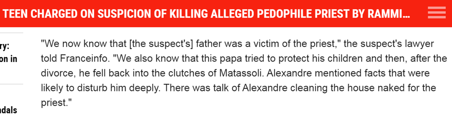 不過,據英國《每日郵報》的報道,Alexandre的父親接受媒體采訪時,卻給出了令人震驚的案情信息:不僅他的兒子——乃至他自己——都曾在童年時遭到神父Matassoli的性侵。