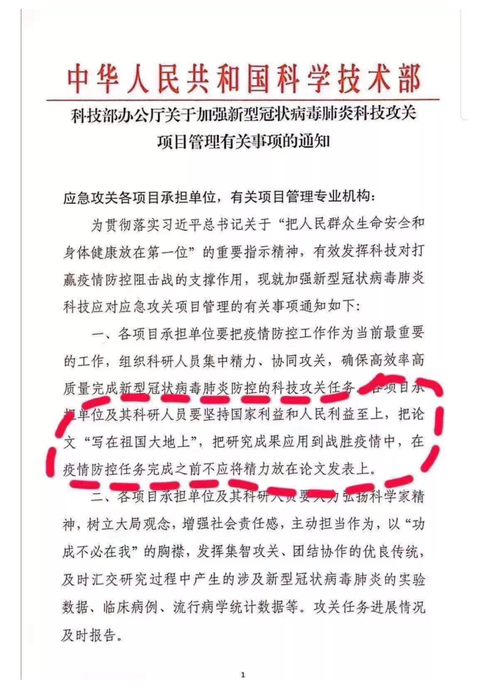 附文:今天,科技部发了《科技部办公厅关于加强新型冠状病毒肺炎科技攻关项目管理有关事项的通知》。通知里强调要“把论文写在祖国大地上,把研究成果应用到战胜疫情中,在疫情防控任务完成之前不应将精力放在论文发表上”。