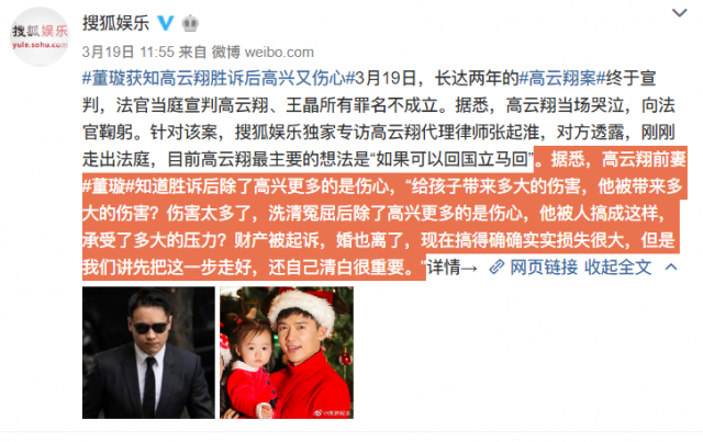 搜狐娱乐独家专访到张起淮,对方称高云翔的前妻董璇知道宣判结果后又高兴又伤心,“他被人搞成这样,承受了多大的压力?”言语间似乎还带着对高云翔的心疼。