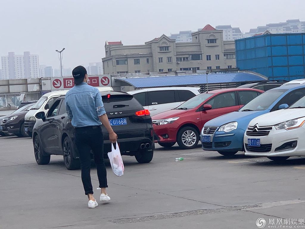 他身穿蓝色牛仔衬衫配黑裤子,反戴棒球帽,身材高大引人注目,虽然沧桑了一些但还是十分帅气。