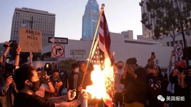 (图:示威者点燃美国国旗,图源:the hill)
