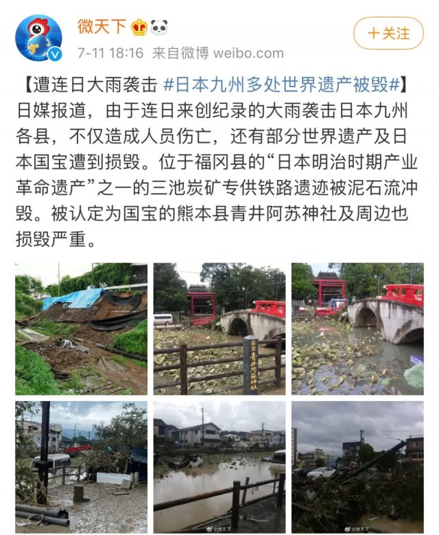 位於福岡縣的“日本明治時期產業革命遺產”之壹的叁池炭礦專供鐵路遺跡被泥石流沖毀。