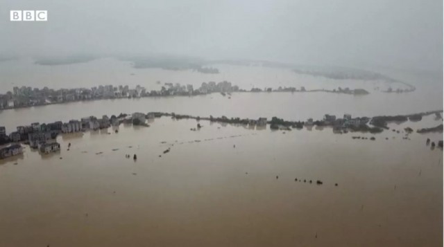 航拍畫面顯示,洪水淹沒了幾乎整個市,農作物也損失慘重。