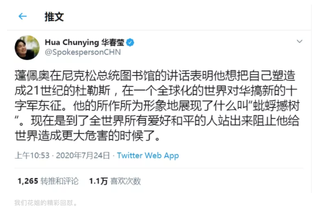 7月24日上午10点53分,华春莹发表措辞严厉的推特(@ SpokespersonCHN):