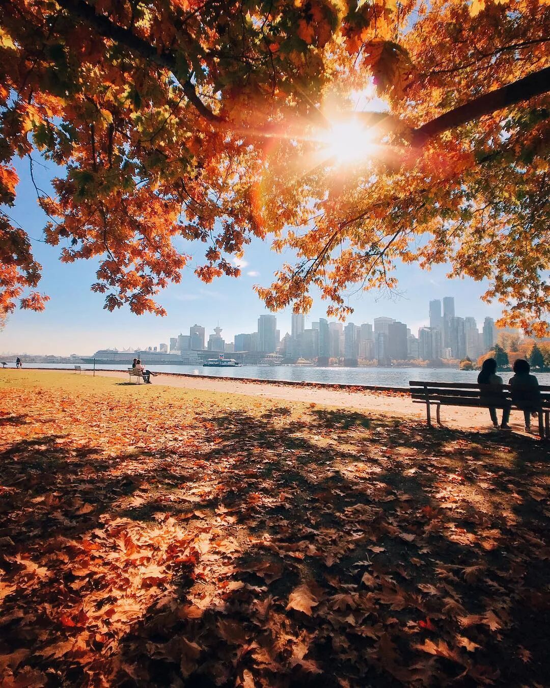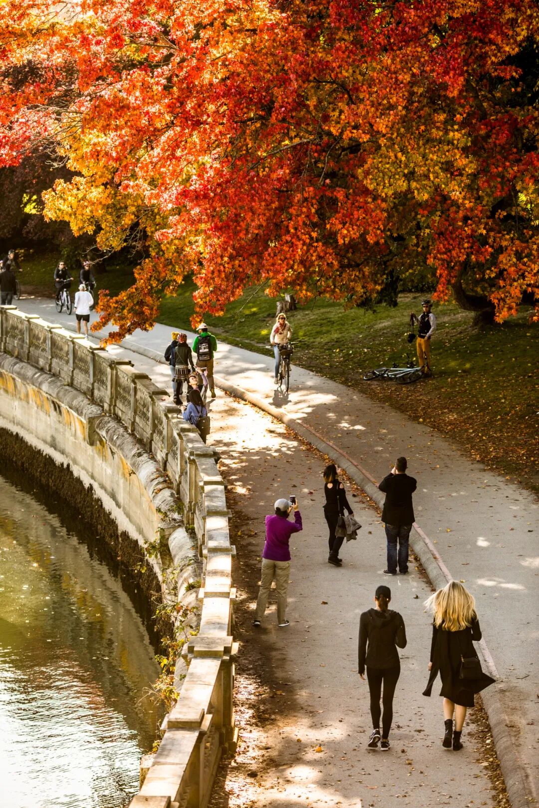 想欣赏任何季节的自然景色,去斯坦利公园总不会错。公园内植被众多,秋色怡人。你可以租一辆自行车,沿着公园平坦的步道一边骑行,一边自在地赏枫。还可以悠哉地靠在公园的长椅上发发呆,晒晒秋阳。