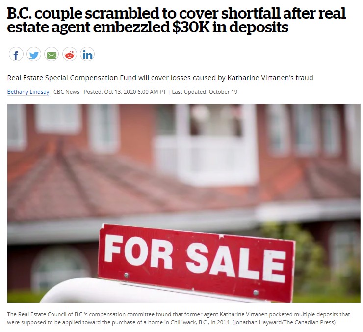 根据CBC今年10月的报道,由于这位前女经纪还私吞另外一个客户30,000元的购房定金,当局不得不用协会的补偿基金替这位女经纪买单。