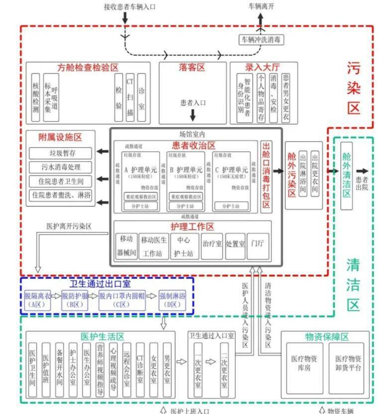 中國官方發布的方艙醫院導則中將醫院內細分為多區。(圖取自微信)